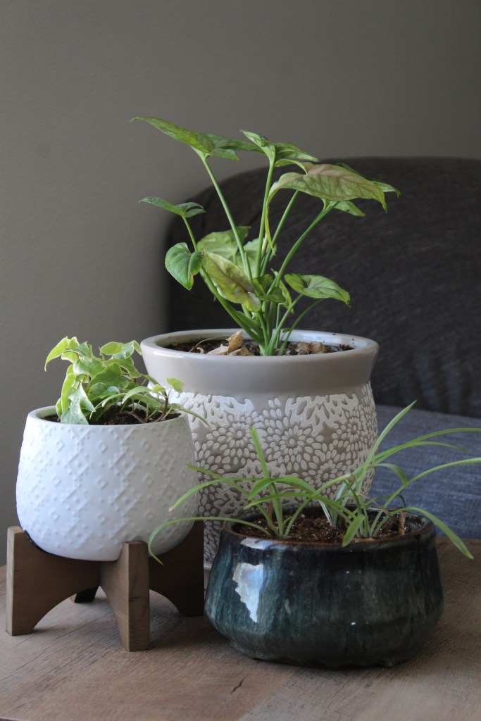 Once your roots are between 1.5-2inches long, it is time to transplant them into the dirt. I utilized three stems, which luckily all grew roots. I transplanted all of these stems into a single cute little pot using a specially formulated soil for indoor plants. I have used standard potting soil in the past and have had issues with little gnats living in the dirt so I am hoping that the dirt specific to houseplants will help to eliminate those little buggers!