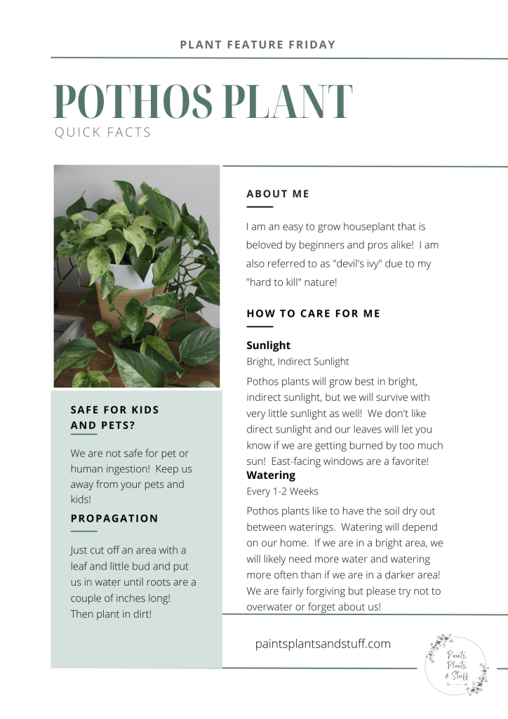 I purchased my first Pothos plant while I was in college and loved it! I recently began propagating my plants and I’m tempted to have a few in each room of my house due to their full look and how easy they are to grow! I also like how they can trail down a pot, table, or shelf!