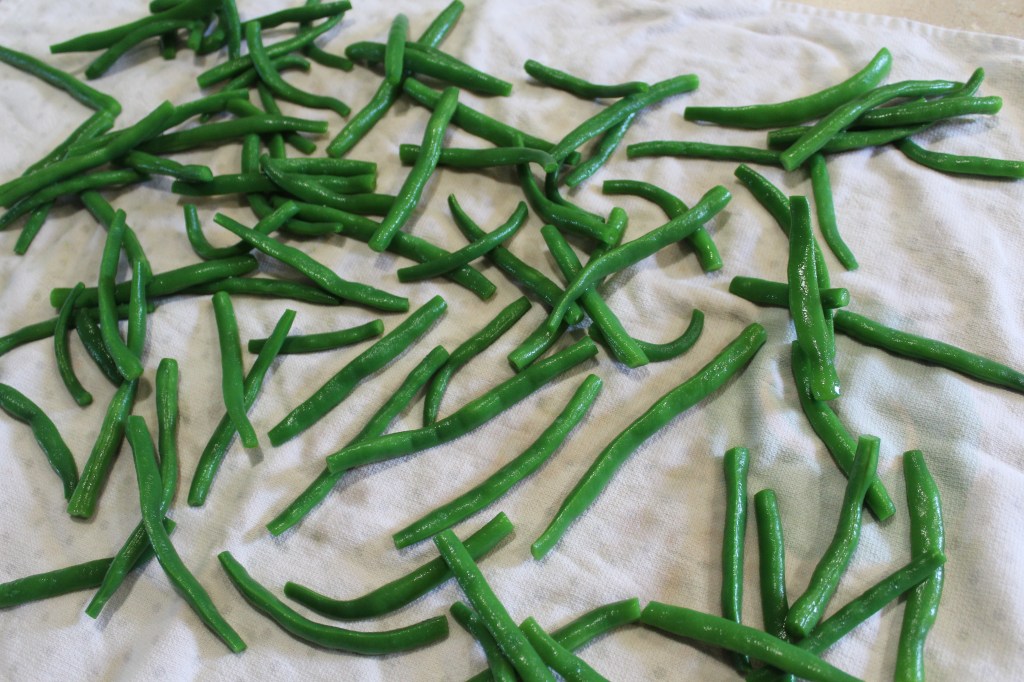 Continue this process until all of your beans are blanched. Then, spread thinly onto a towel and allow to air dry for 20-30 minutes. While they don’t have to be perfectly dry, you don’t want them to freeze together.