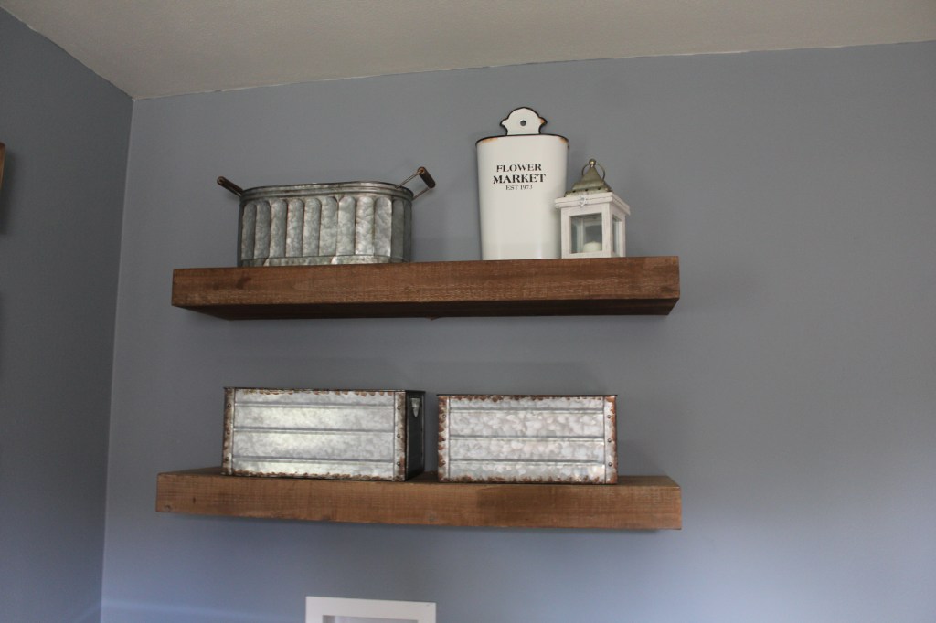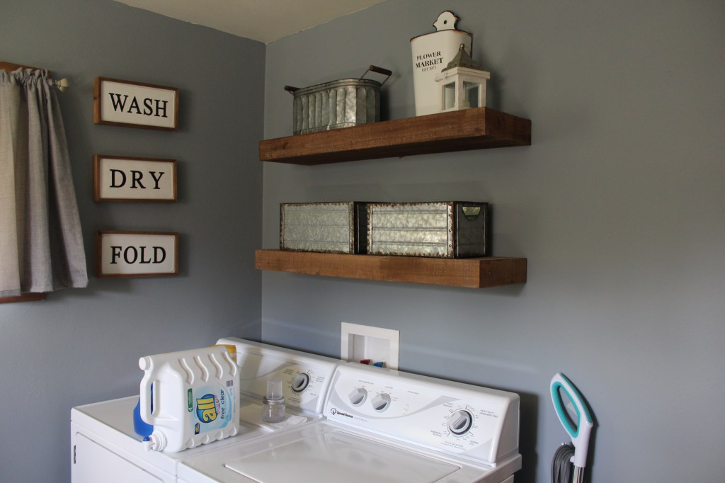 The laundry area is organized with a couple of floating shelves from Hobby Lobby! Actually, I think all of the decor here is from there… dangerous place haha! The bins store things like a first aid kit, extra filters for our water pitcher, dusters, and the cloths for our steam mop. I like how they look, but they are also great at making stuff look and feel organized!
