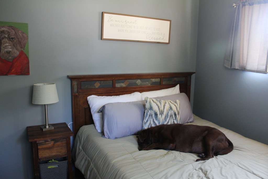 First of all… as you can see… Cara thinks this is her room! 🙂 We have a queen bed in here. There is a very small amount of space between the wall and the bed but not enough for another end table. Caleb built the wooden end table and I stained it earlier this summer! We got the headboard from his grandparents. The puppy painting was done by Caleb when we were dating after I told him one of my first purchases when I have a place separate from my parents was going to be a chocolate lab! The throw pillow is one I stole from our living room set because it matched the comforter from Kohl’s so well! Wall color is Display by Joanna Gaines (Magnolia Home) and wooden sign is from Hobby Lobby! Lamp stand and shade I believe are from Walmart… but we got them a long time ago so I’m not entirely sure!