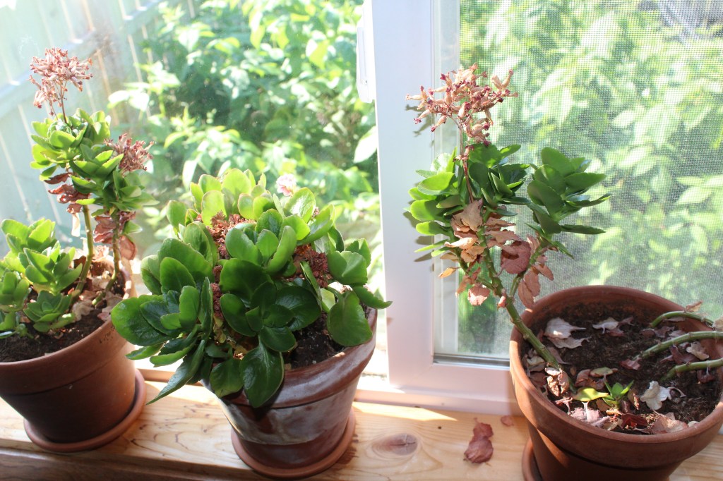 I believe the outside pots contain a type of Christmas Cactus and the center pot (covered in hard water stain) is a Calandiva.