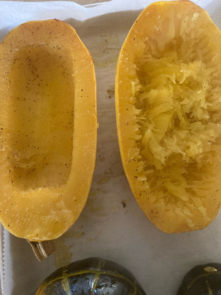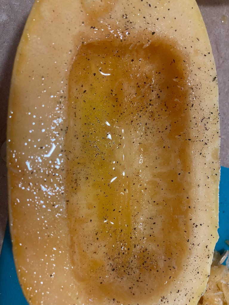 For spaghetti squash, cut the long way, like a hotdog bun. Scoop out the seeds and “guts.” Lightly coat any edible area showing with olive oil and sprinkle with salt and pepper. Place onto a parchment lined baking sheet edible side down (skins showing).