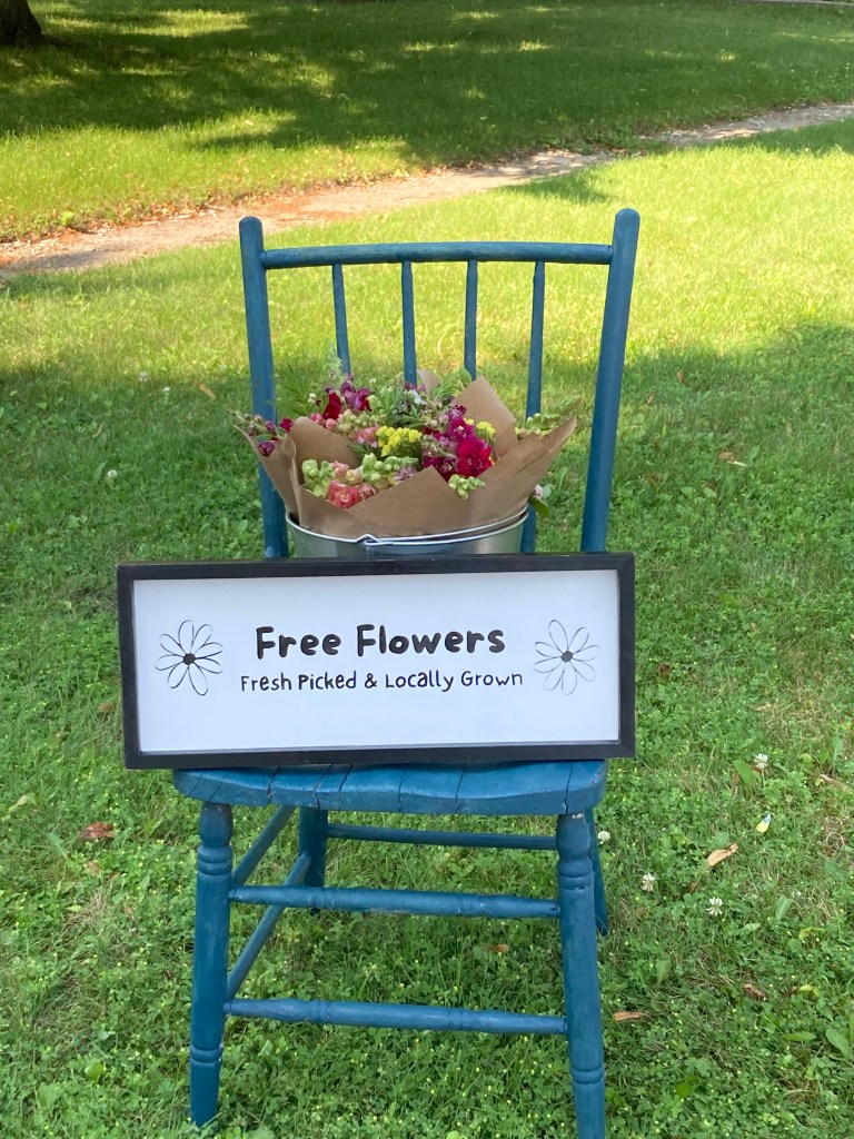 Flash forward to when I had thousands of flowers ready to share with the world… I didn’t want to wake up early to attend the market or worry about profits. So instead, I decided to grow, pick, and arrange. I did everything that I love to do. Talking with my husband, we decided to donate the bouquets. I drove around town with his grandma and we delivered about 30 of my first bouquets to people around town. While I really enjoyed going around town and delivering, I wanted more of a hands off approach to getting the bouquets out into the world. I painted an old chair and used my Cricut to make a cute little free flowers sign and I put it on the curb with a bucket of 5-6 bouquets. The first few days they were slow to go, but over time more and more people stopped. I loved to see the smiles. It made everything 100% worth it. I received thank you cards on the chair. People stopped whenever they saw us outside to say thank you. IT WAS AWESOME.